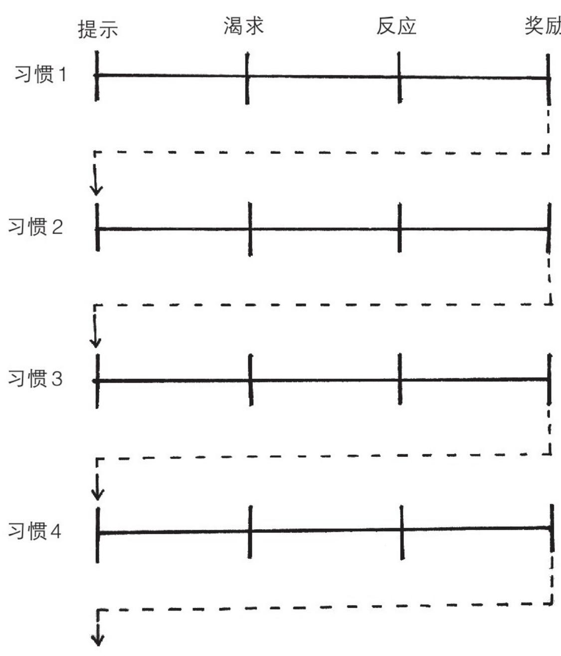 许多人类行为遵循这一回圈。你经常会根据刚刚完成的工作来决定下一步该做什么。去洗手间就要洗手并擦干手,这又提醒你需要把脏毛巾放进洗衣筐里,于是你的购物清单上还要新增洗衣粉,等等。任何行为都不是孤立的。每个动作都成为触发下一个行为的提示。