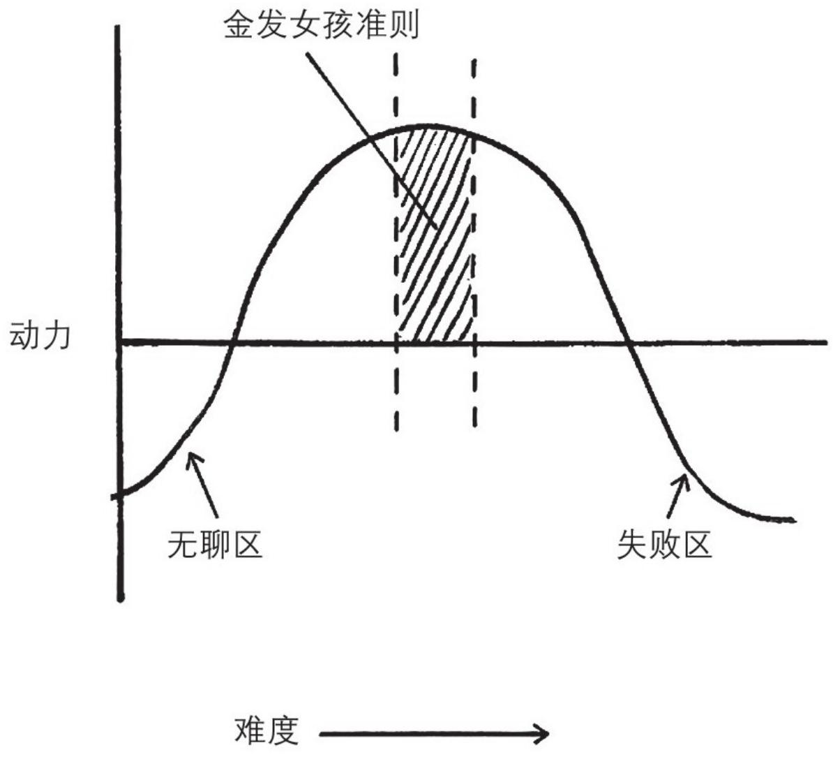 图 15:人们在面对一个勉强能应付的挑战时动力最充足。在心理学研究中,这被称为耶克斯- 多德逊法则,231 它把最佳激励水平描述为处于枯燥乏味和焦虑不安之间的中点金发女孩准则指出,人们在处理其能力可及的事务时积极性最高。难易程度适中,刚刚好。