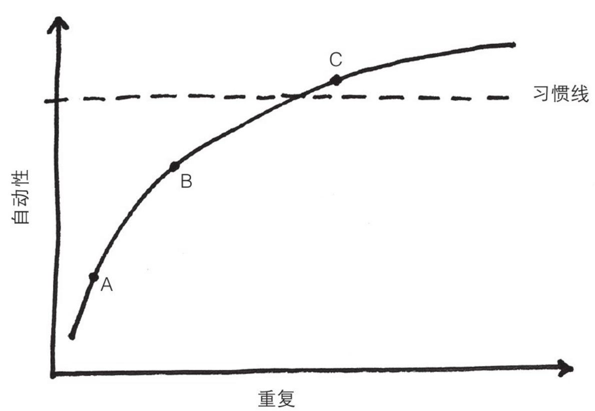 图 11:在开始时(A 点),一个习惯动作需要极大的努力和专注才能完成。在重复几次后(B 点),它变得容易了一些,但是仍然需要有意为之。经过足够的练习(C 点),习惯成自然,无须有意为之。超越这个界限,即习惯线之后,就可以不假思索地自动完成这个动作,就此形成了一种习惯