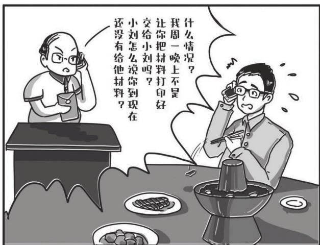 周三早上七点半,小蔡正坐在食堂吃饭,接到了王副主任火急火燎的电话,劈头盖脸就是一顿批评:“小蔡,什么情况?我周一晚上不是让你把材料打印好交给小刘吗?小刘怎么说你到现在还没有给他材料?”