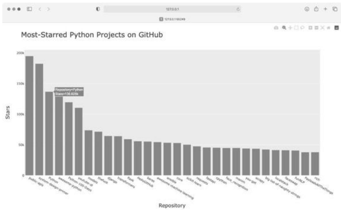 在调用 px. bar()时,将列表 repo_links 用作图形的 x 坐标值。虽然生成的图形与之前相同,但观看者可单击图形底端的项目名,以访问相应项目在 GitHub 上的主页。至此,我们对 API 获取的数据进行了可视化,得到的图形是可交互的,包含丰富的信息!