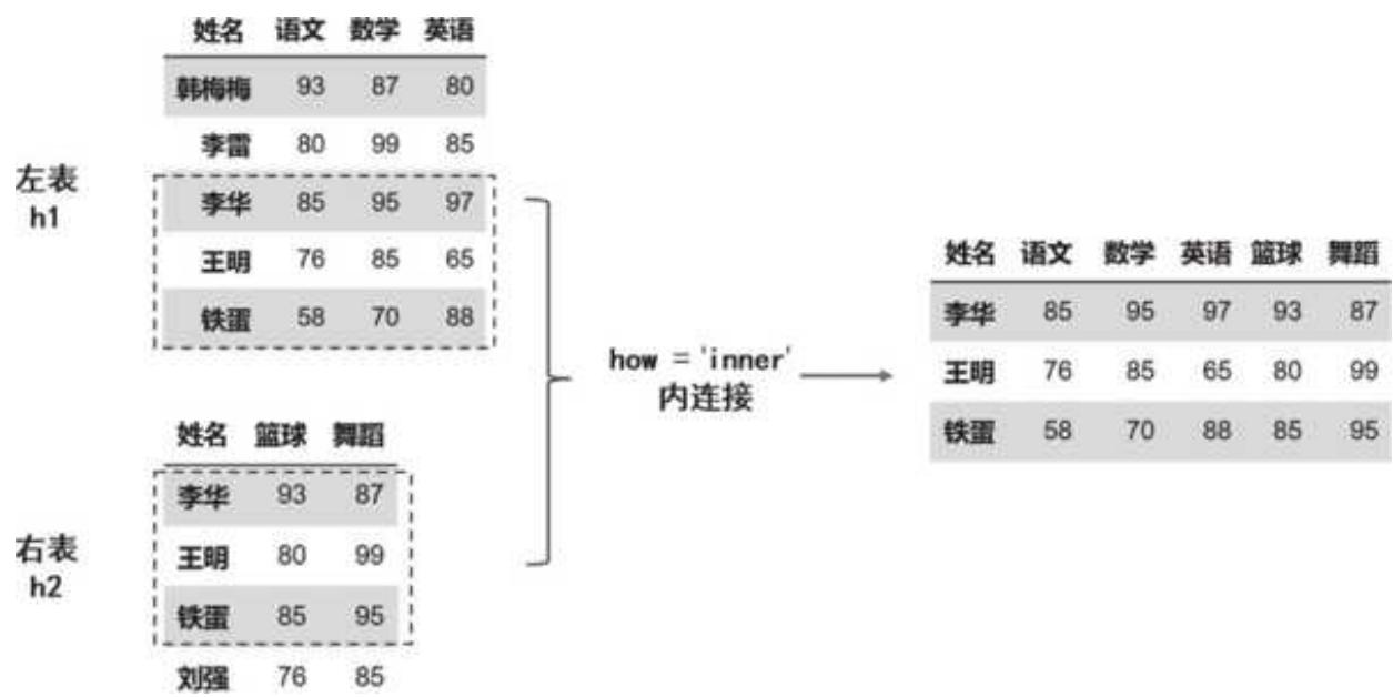 pd.merge (left = h1, right = h2, left_on = '姓名', right_on = '姓名', how = 'inner')
