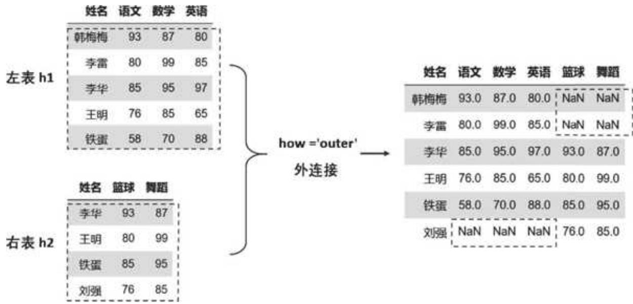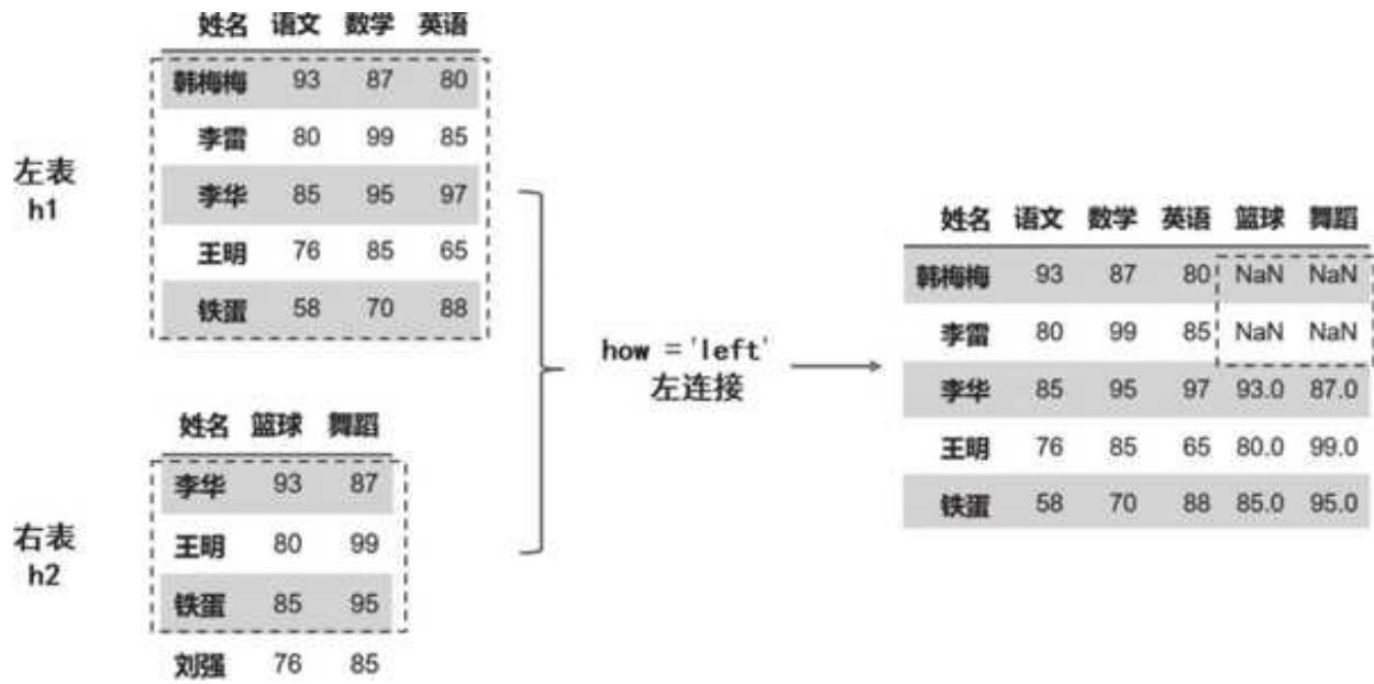 两个 DataFrame 是两张成绩表,表 h1 是 5 位同学的语文、数学、英语成绩,表 h2 是 4 位同学的篮球和舞蹈成绩。