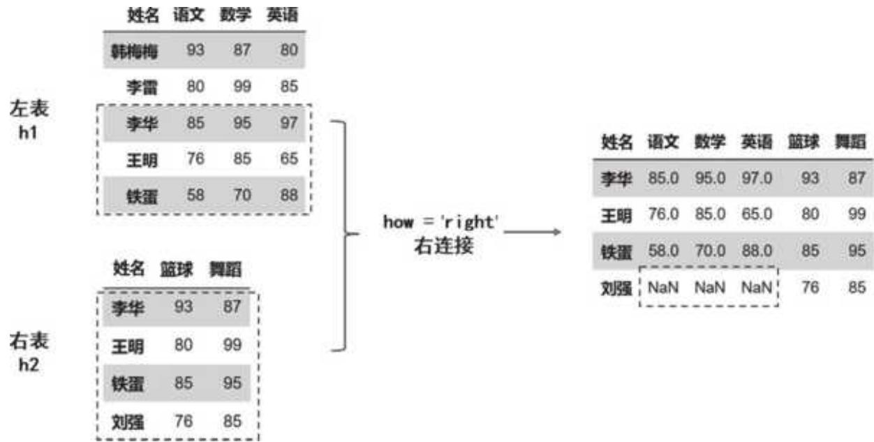 对于左连接(left)和右连接(right),我们可以直观地理解为以哪边的表为大,以谁为大就听谁的(所有行全部保留)。先看左连接,左表 h1 原封不动,右表根据左表进行合并:如果存在相关的名字,就正常返回数据;如果不存在(韩梅梅、李雷),就返回空值。