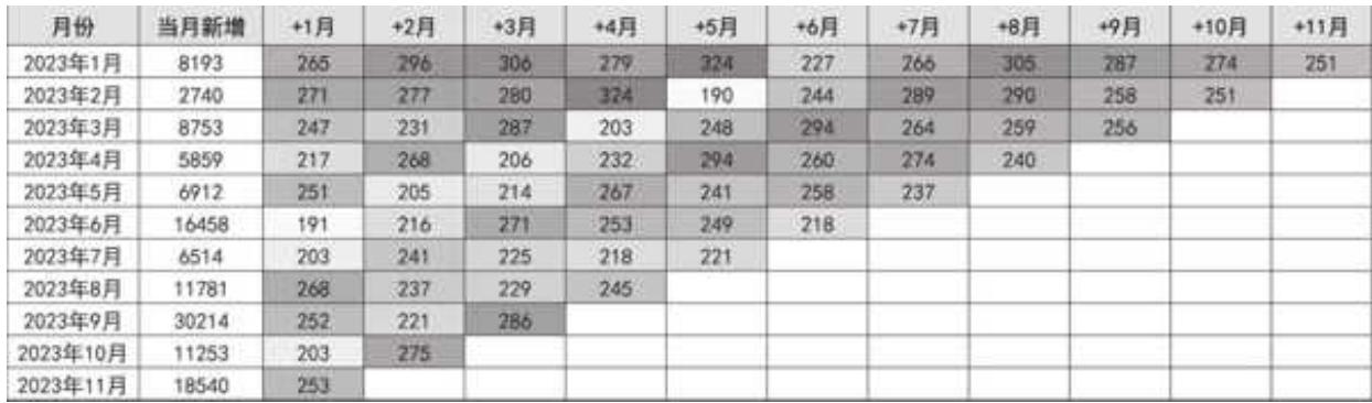 当月新增 | +1 月 | +2 月 | +3 月 | +4 月 | +5 月 | +6 月 | +7 月 | +8 月 | +9 月 | +10 月 | +11 月 | |