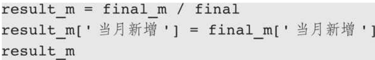 result = final.divide (final ('当月新增'), axis = 0). iloc[:, 1:] result['当月新增'] = final['当月新增']
