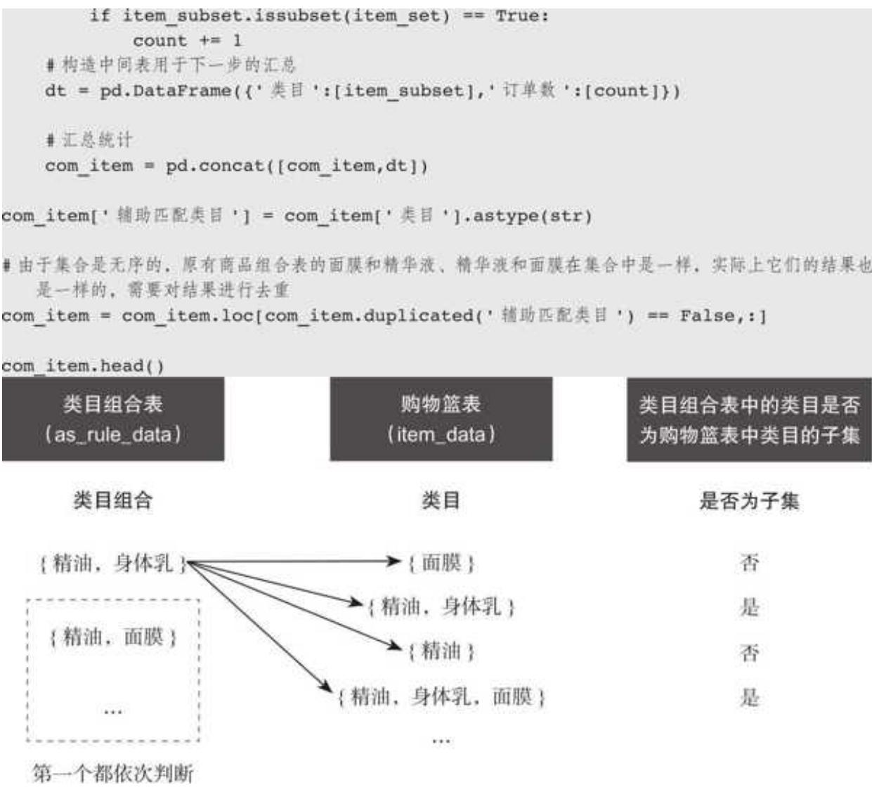 for item_subset in as_result['类目组合']: count = 0 #统计类目组合表中对应类目组合在购物篮订单中出现的次数 for item_set in item_data['类目']: #如果类目是购物篮订单组合的子集 ,则计数加 1