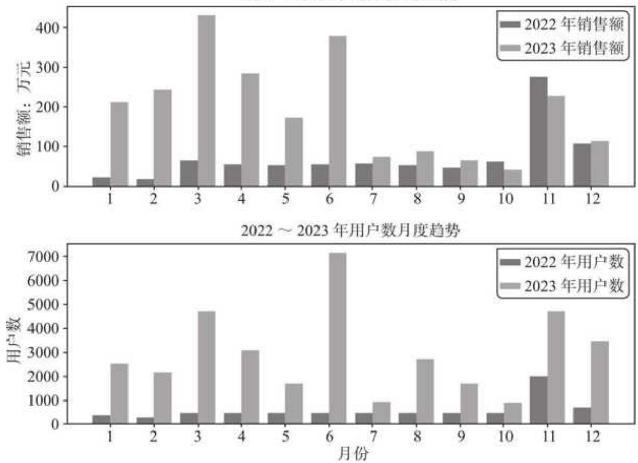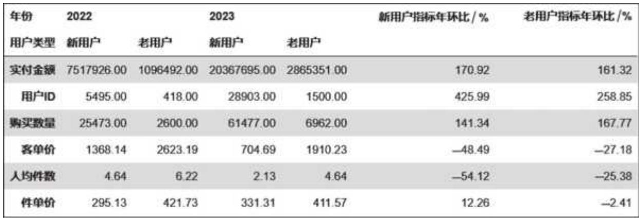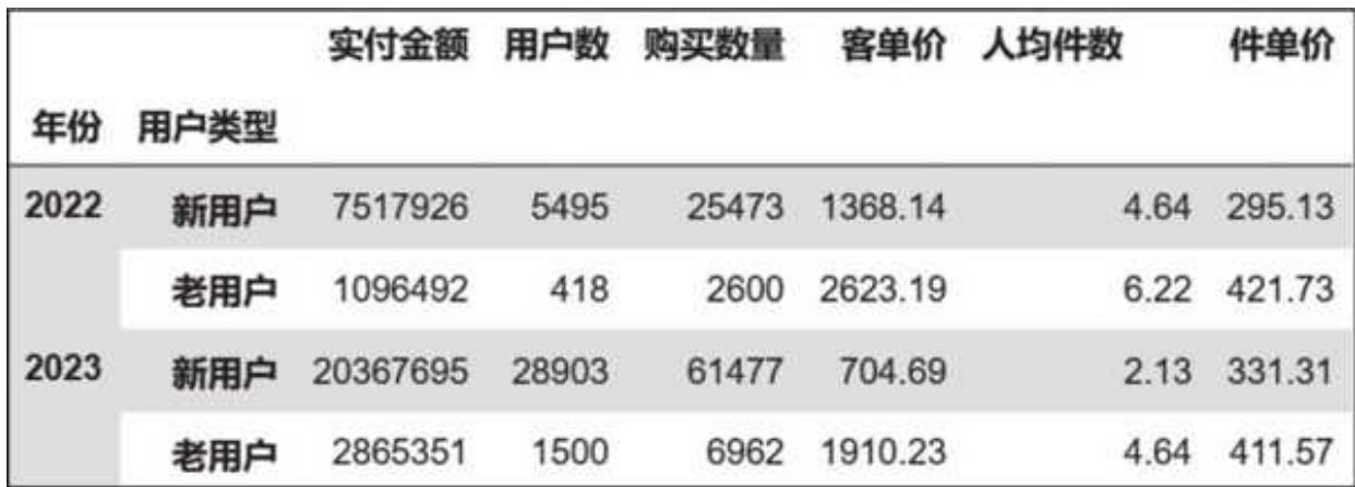 处理完数据后,用总览视角看年度销售和用户变化,再从用户出发,更细致地分析了用户核心指标变化趋势,并做了新老客维度、复购率、购买时间间隔的分析,刻画用户购买行为变迁。商品维度分析主要集中在类目销售结构变化,价格带的宽度、深度和广度以及商品的集中度趋势。