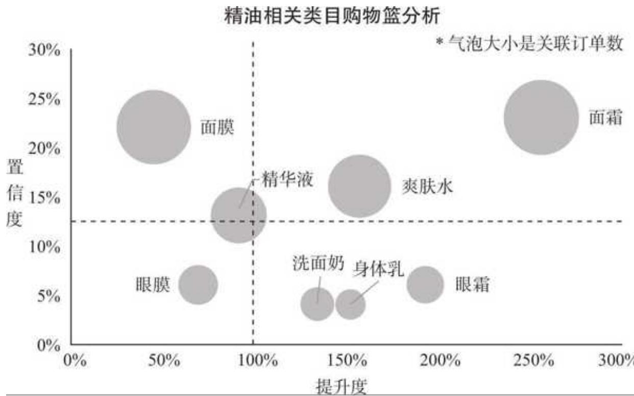 口面膜独占气泡图的左上角,它与精油的支持度和置信度都很高,不过提升度不足