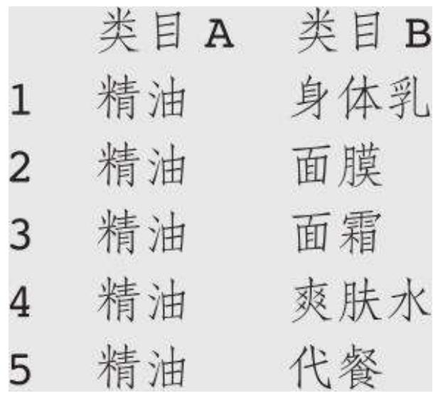 类目 A | 类目 B | 类目组合 | 辅助匹配类目 | 类目 A 的订单数 | 类目 B 的订单数 | 关联订单数 |