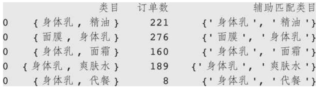 as_result = pd.merge (as_result, com_item '辅助匹配类目', '订单数', left_on = '辅助匹配类目', right_on = '辅助匹配类目', how = 'left') as_result.rename (columns = {'订单数': '关联订单数'}, inplace = True) as_result.head ()