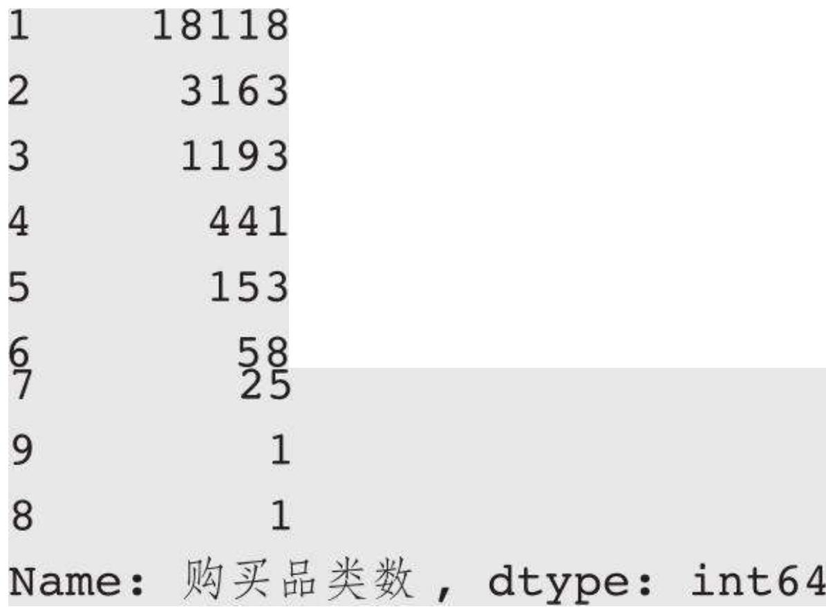 item_data['购买品类数'] = item_data['类目']. apply (len) item_data. loc[item_data['辅助判断类目']. str.find ('面膜') != - 1, '购买品类数'. value_counts ()