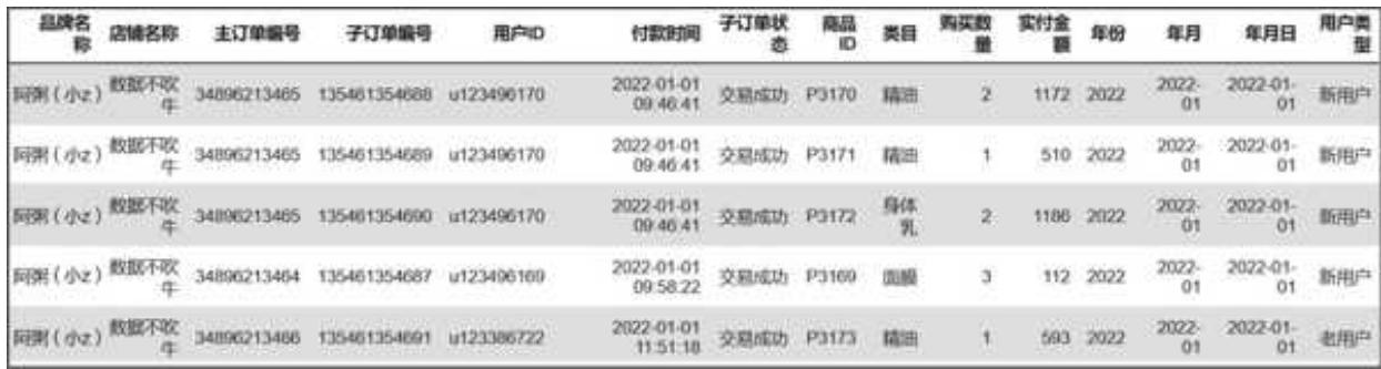 品牌名称 | 店铺名称 | 主订单编号 | 子订单编号 | 用户 ID | 付款时间 | 子订单状态 | 商品 ID | 类目 | 购买数量 | 实付金额 | |