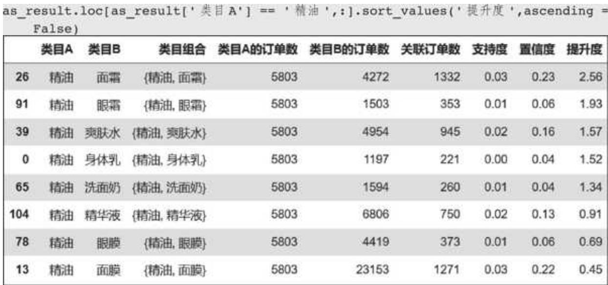 精油类目表现出较好的关联特征,按照提升度排序,精油和面霜的提升度高达 2.56,置信度也有