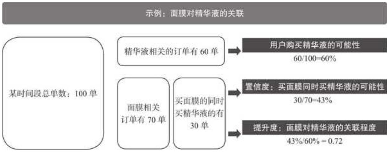 和面膜同时出现频次最高的品类是精华液,置信度为 0.07,即 100 笔买面膜的订单中会有 7 笔订单同时购买精华液。值得注意的是,结合提升度我们发现,面膜相关的所有品类提升度均小于 1,最大的也只有洗面奶的 0.7,这说明了面膜品类虽然畅销,但绝大部分订单并非连带购买。