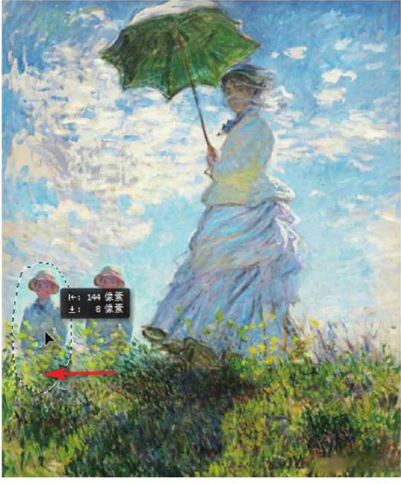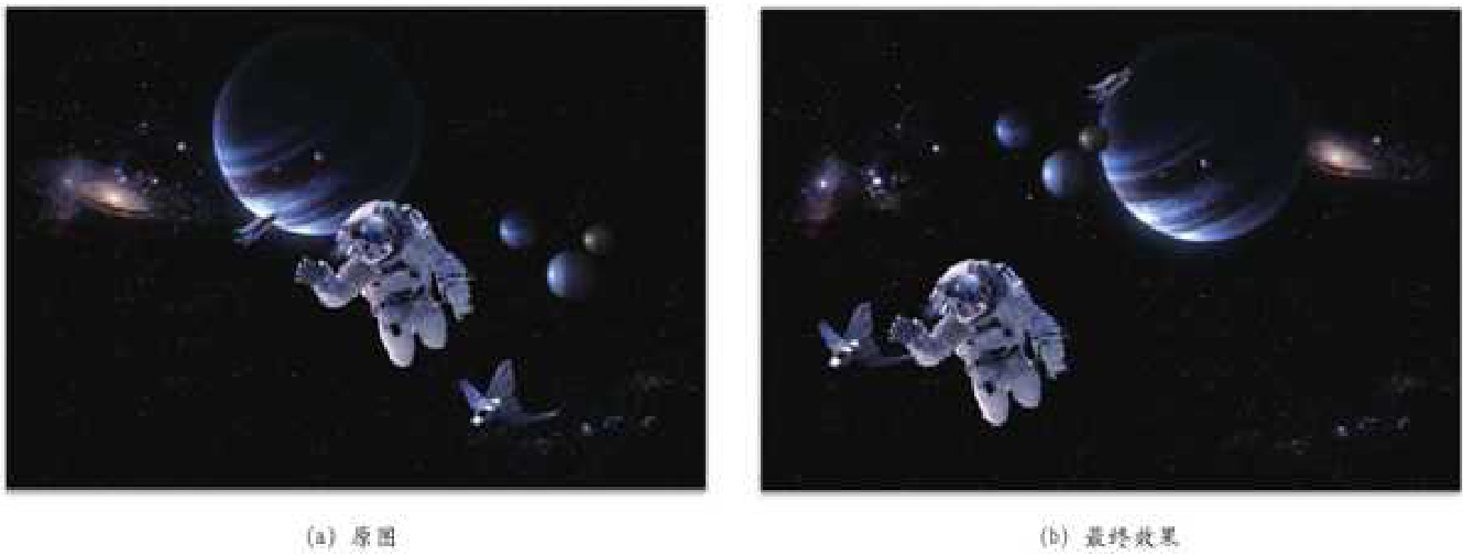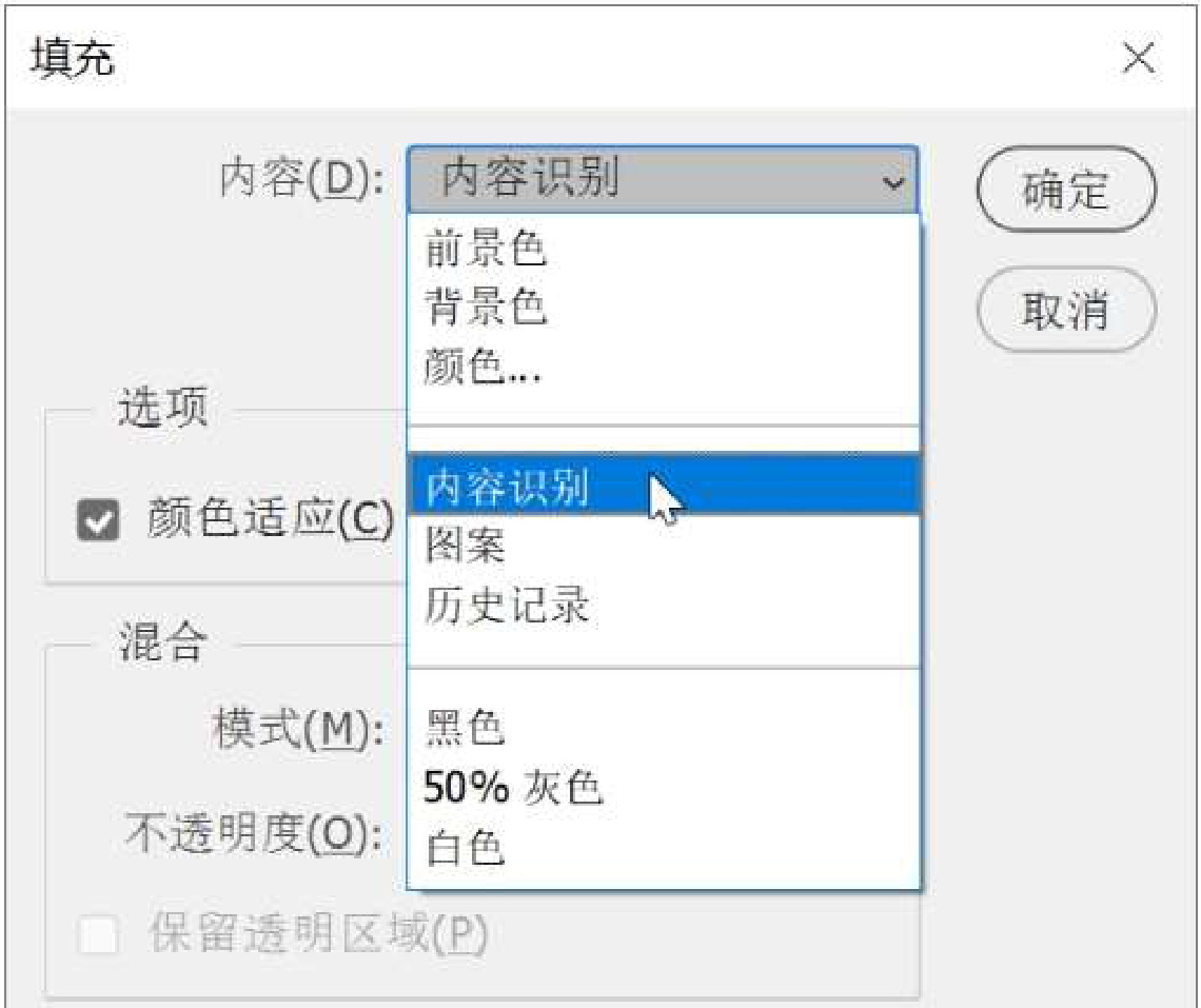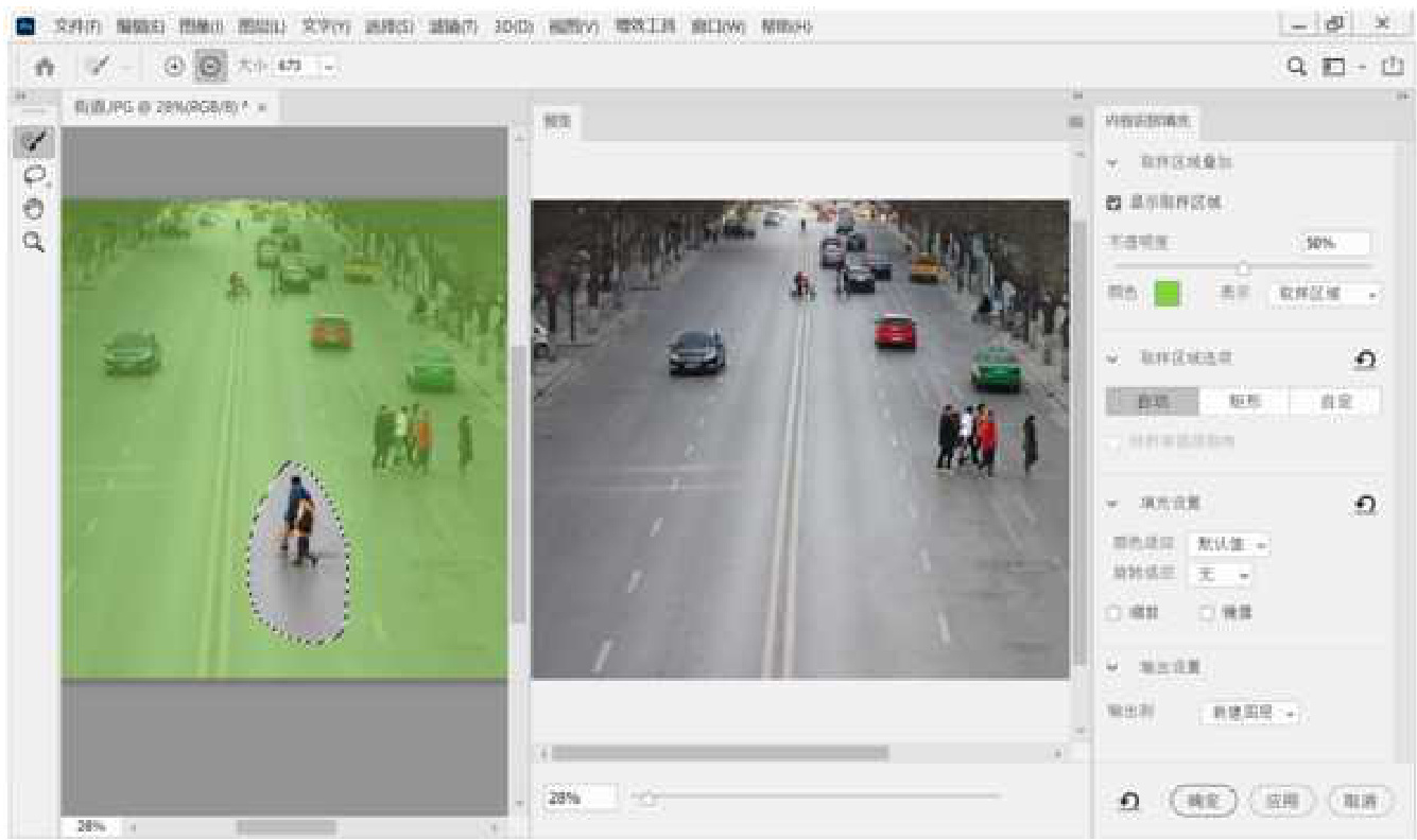 ●使用【裁剪工具】拖曳顶端和四边的中点修改画布大小,不但可以缩小画布,还可以扩大画布。选中【内容识别】复选框,当画布扩大完成时,Photoshop 会智能填充扩大的新内容,一般适合不太复杂的边缘,如天空、水面等,而不适合边缘有人物、文字等内容的复杂边缘。