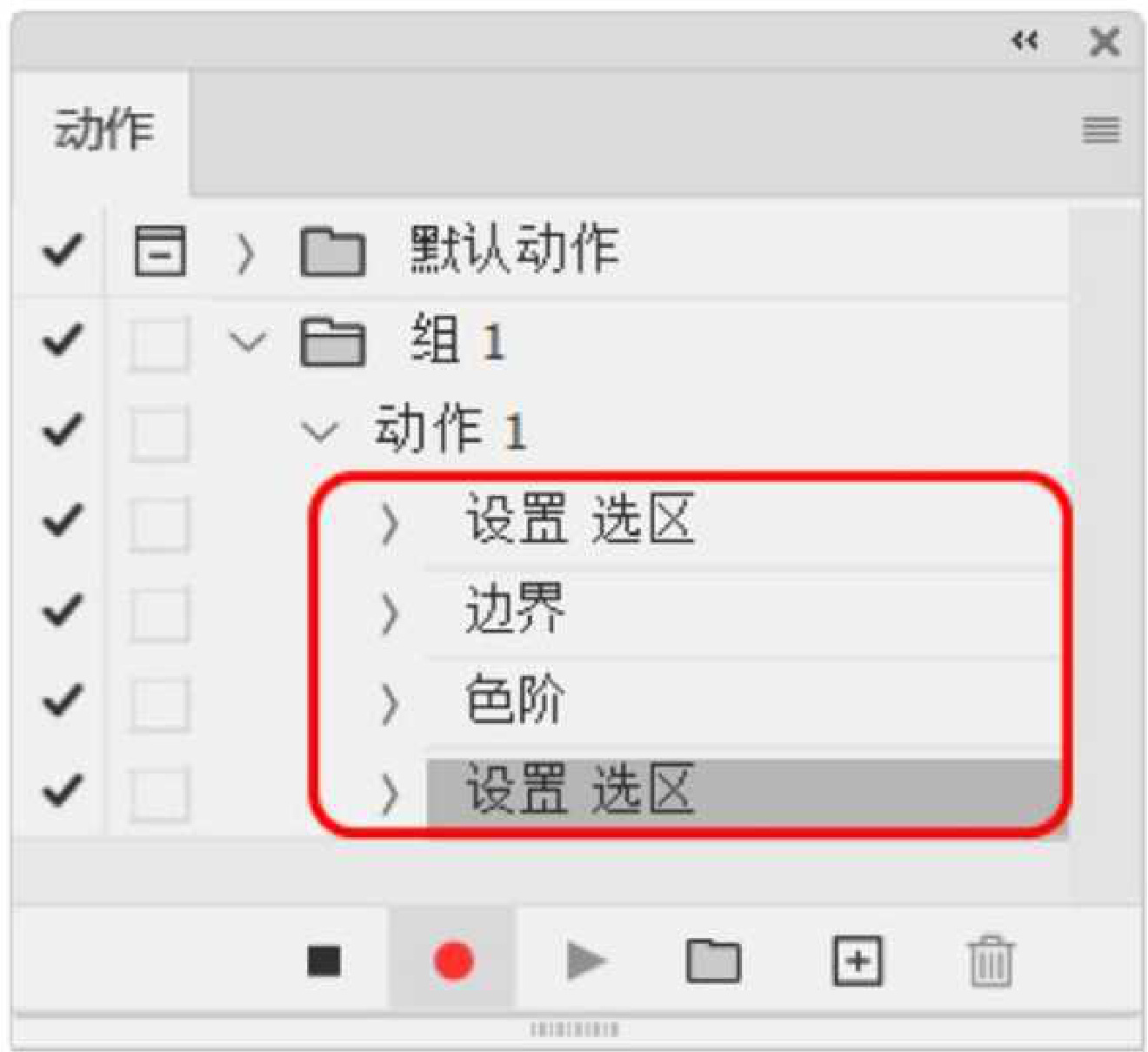 动作是指在单个文件或一批文件上执行的一系列任务,也就是 Photoshop 对文件的具体操作,如菜单命令、属性参数设置、图层面板的图层操作等。动作可以被记录、编辑、自定义和批处理,也可以使用动作组来管理各组动作。