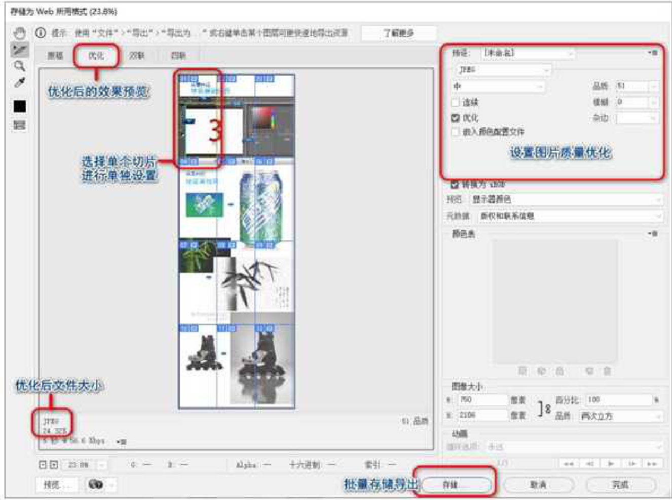 导出切片需要执行【文件】-【导出】-【存储为 Web 所用格式】命令,快捷键为 Shift+Ctrl+Alt+S,打开【存储为 Web 所用格式】对话框,如图 A 27-22 所示。