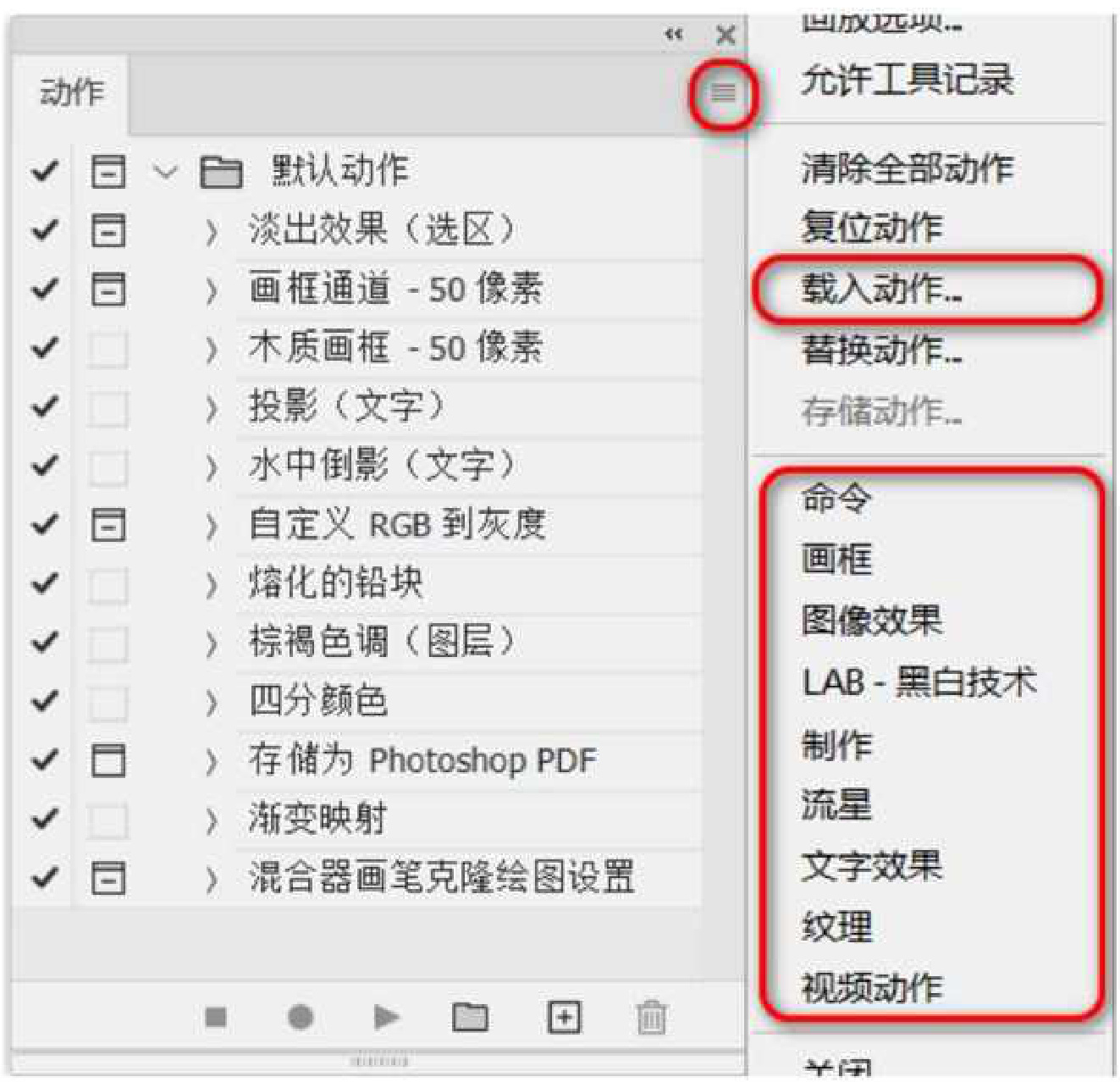 感兴趣的读者,可以再试试其他动作。在【动作】面板菜单上,你也可以加载更多的默认动作库,还可以通过【载入动作】命令载入外部 ATN 文件资源,以丰富动作库,从而一键做出很多复杂的效果,如图 A 28-4 所示。