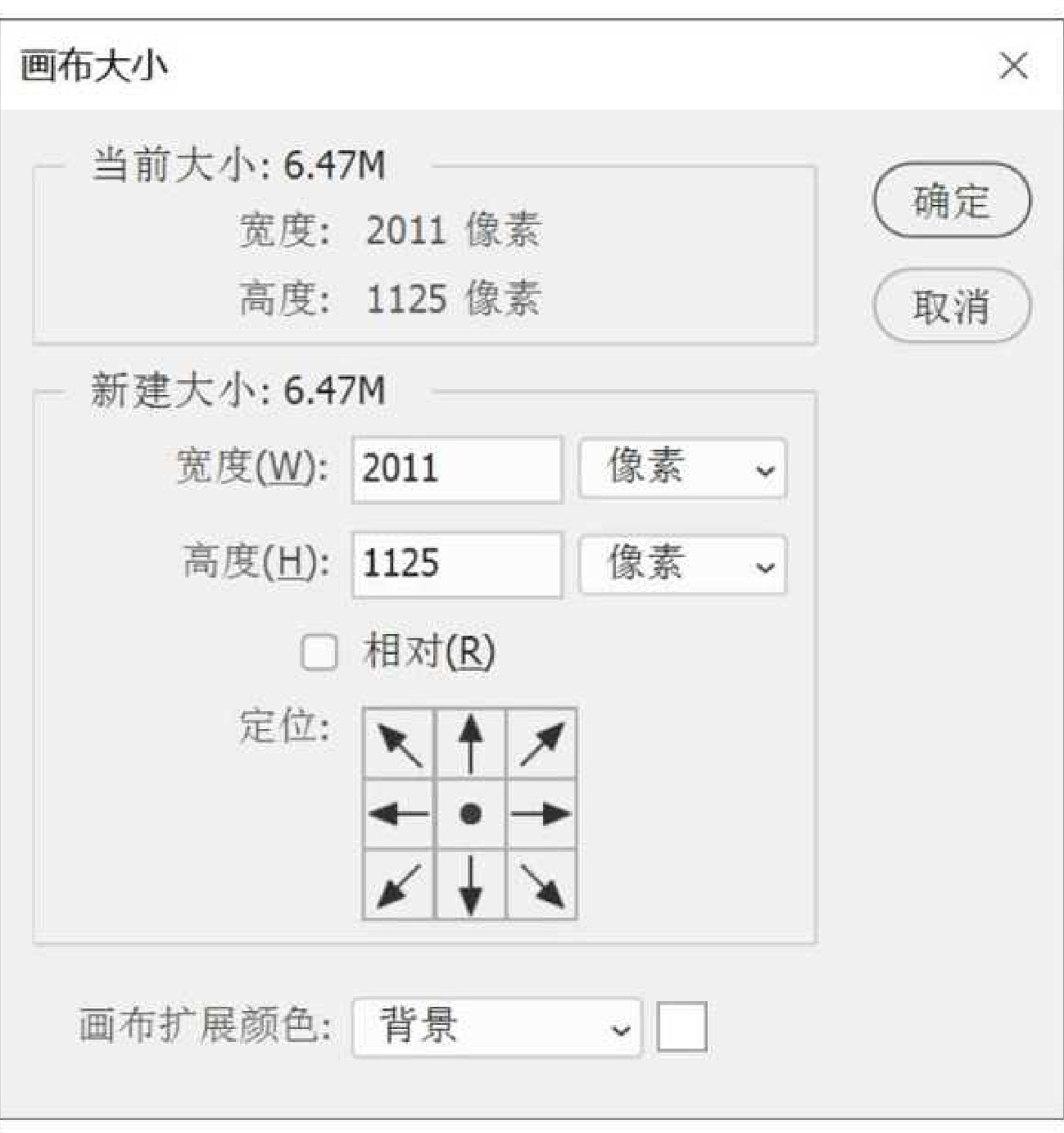 ●选中【相对】复选框,可以输入正负值以控制画布的扩大或裁小。例如:要将画布宽度扩大 100 像素,直接在【宽度】文本框中输入 100 像素即可;若要画布宽度缩小 100 像素,则输入–100 像素。