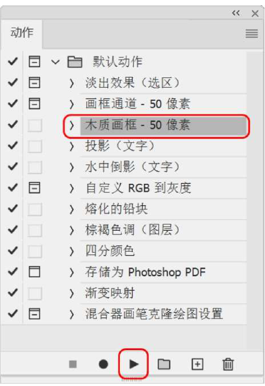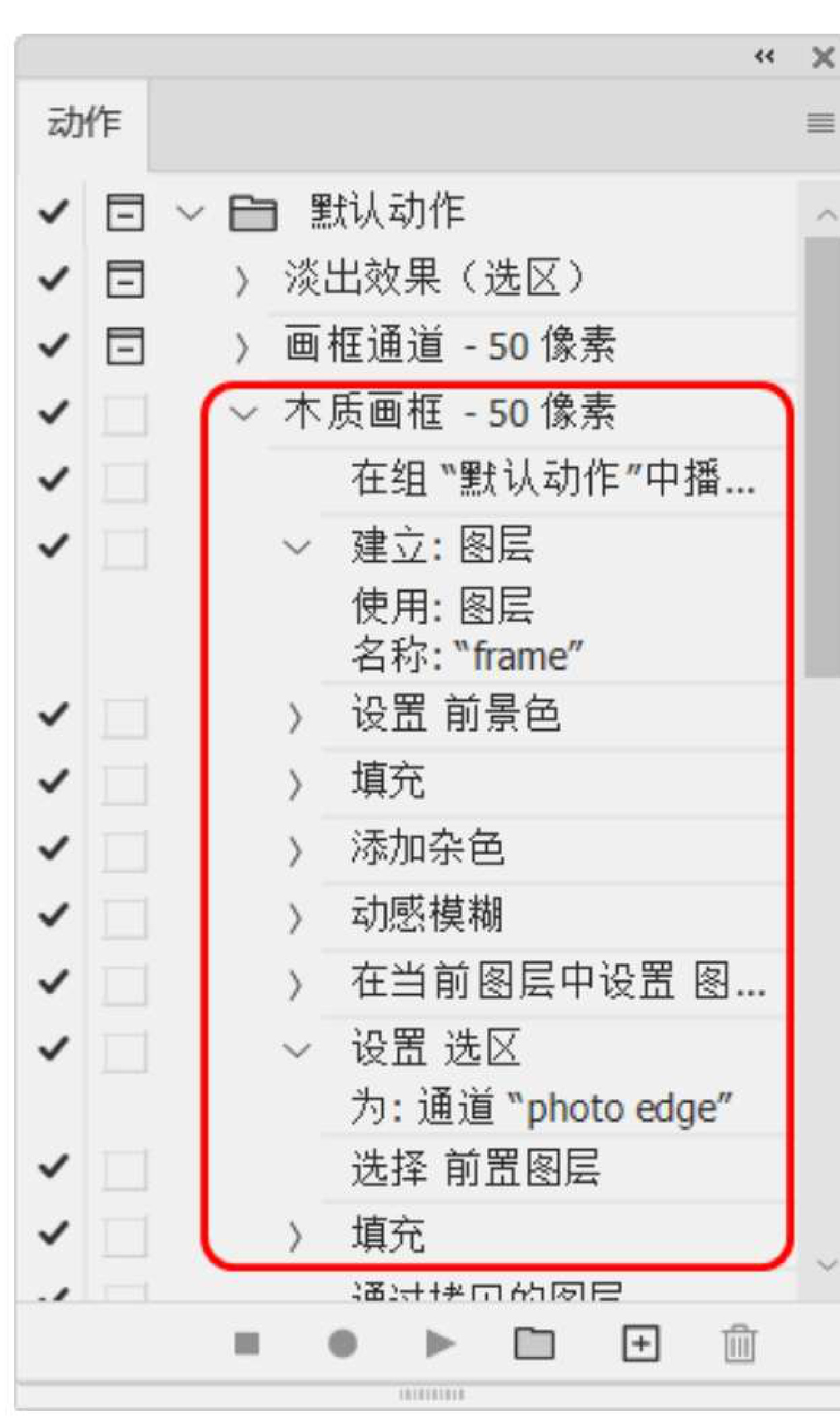 现在观察动作,展开【木质画框-50 像素】(见图 A 28-5),可以发现里面有很多具体的步骤,这些步骤就是一个个动作,那么这些动作是如何被记录下来的呢?
