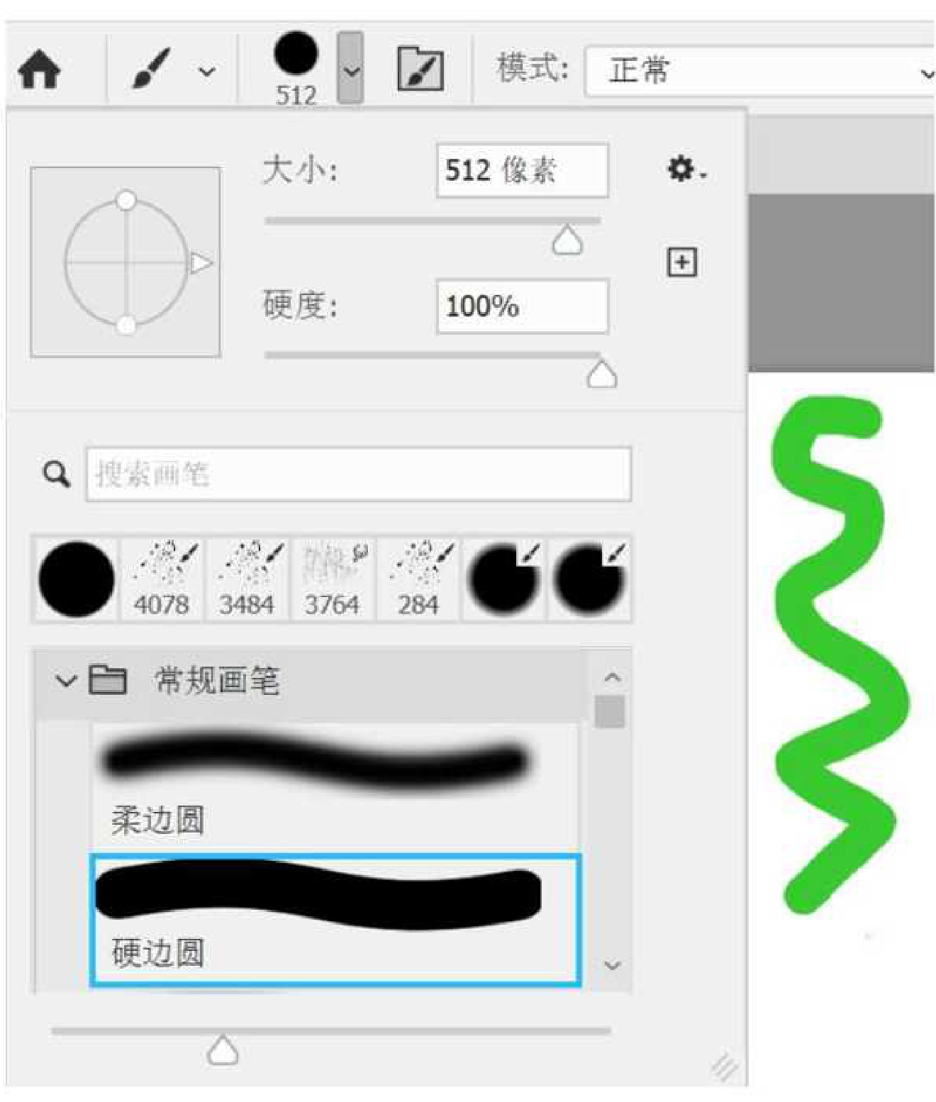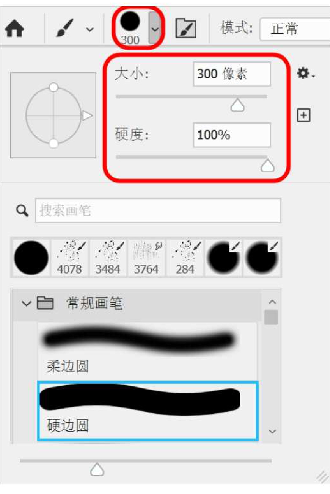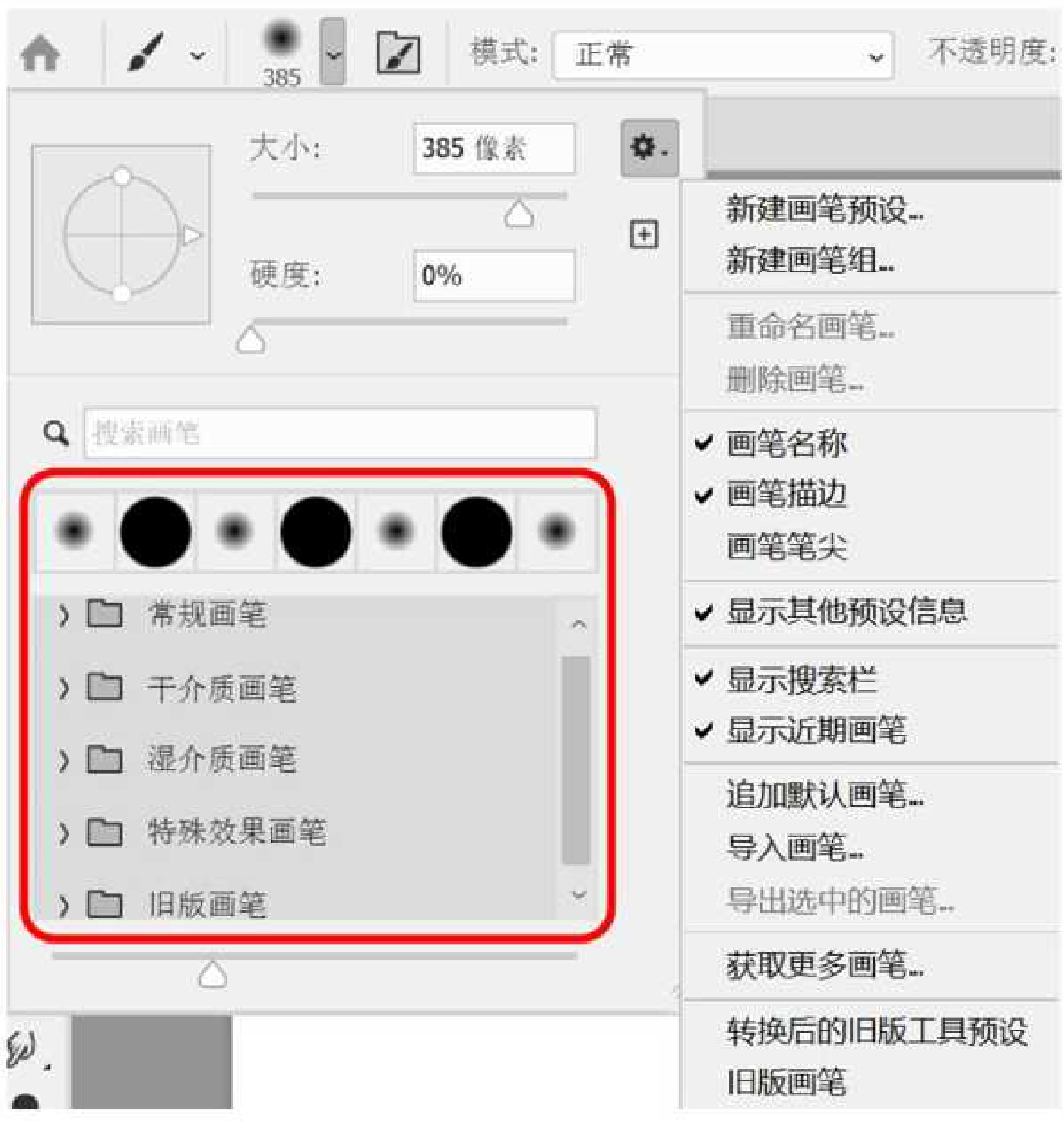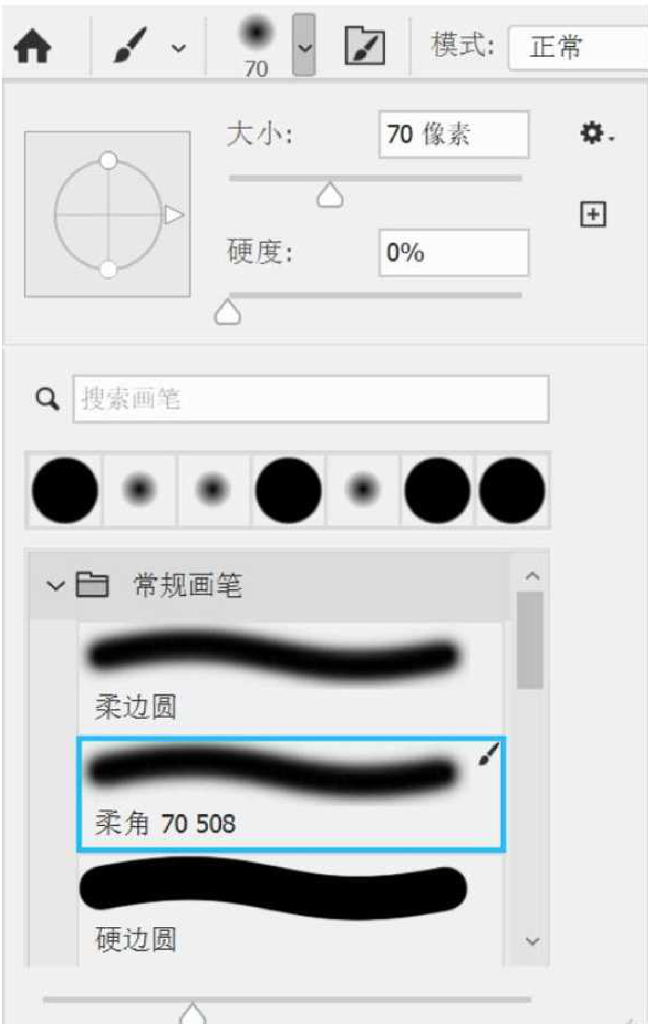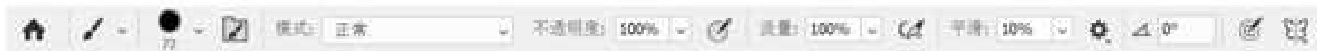 选项栏是调节工具参数的面板,例如,选择【画笔工具】后,可以在选项栏中调节画笔的大小、模式等,如图A03-4 所示。