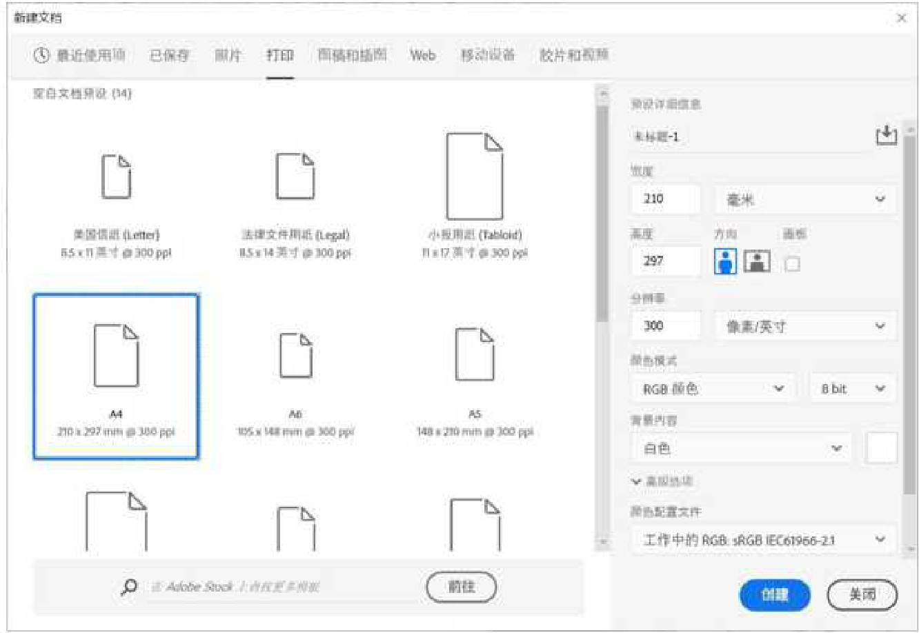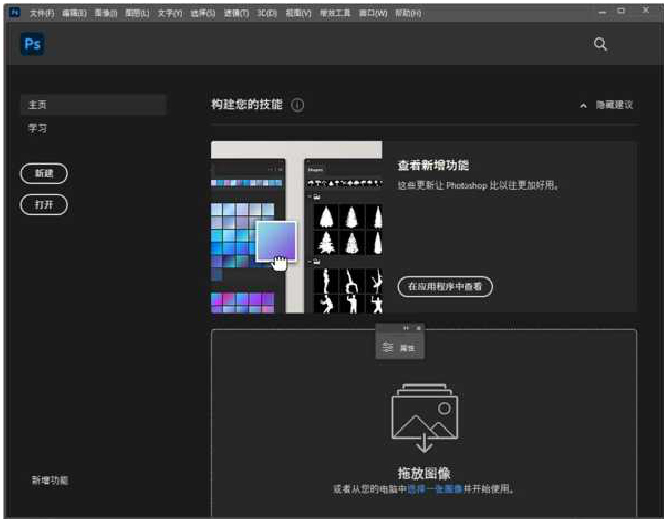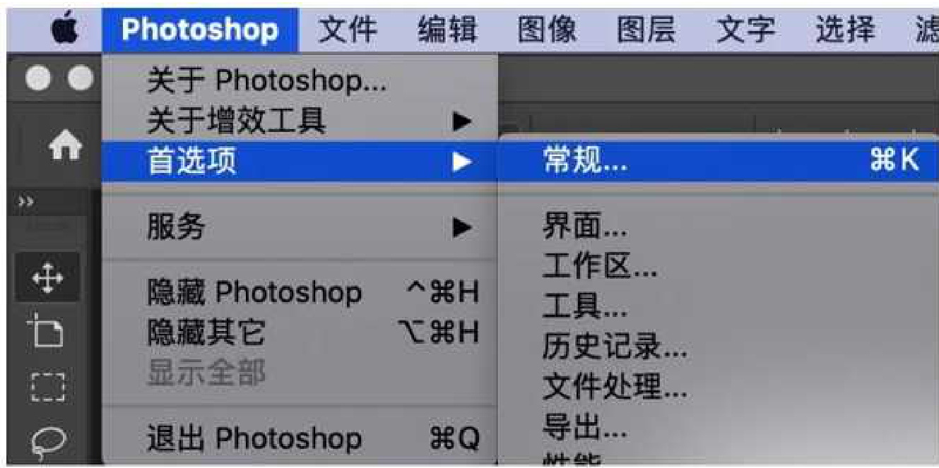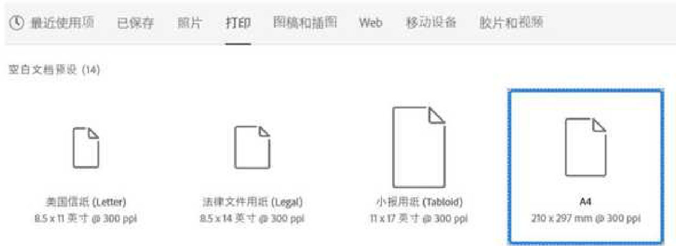 启动Photoshop,一般默认会显示【主屏幕】工作区,如图A03-1所示。可以新建、打开文件或者打开最近使用项,执行【编辑】-【首选项】-【常规】命令,在打开的对话框中取消选中【自动显示主屏幕】复选框,关闭【主屏幕】的显示。另外,为了得到最佳印刷效果,本书采用软件的浅色界面进行讲解,执行【编辑】-【首选项】命令,弹出【首选项】对话框,然后在【界面】-【外观】-【颜色方案】下设置工作区域的亮度为浅色,在实际使用过程中,可根据自己喜好进行设置。