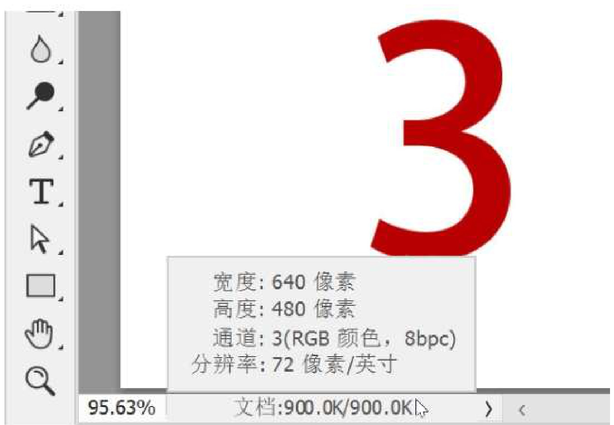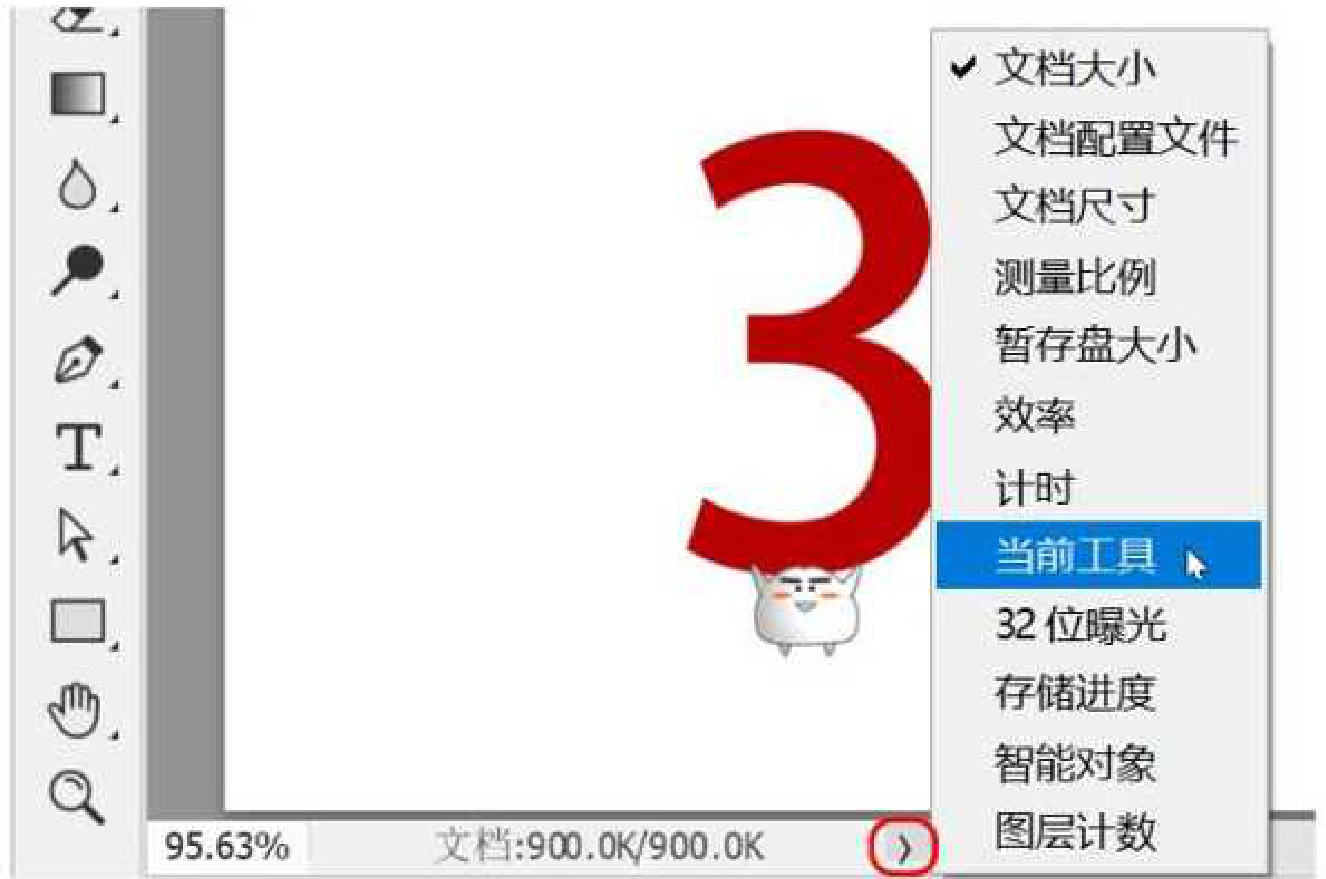N在状态信息栏中可以输入图像显示的百分比,单击 按钮可以显示几个工作信息,例如,可以选择【当前工具】选项,旁边就会显示目前使用的工具信息。按住工作信息不放,可以快捷地查看文档的详细信息,如图A03-8所示。