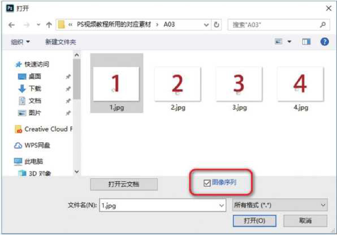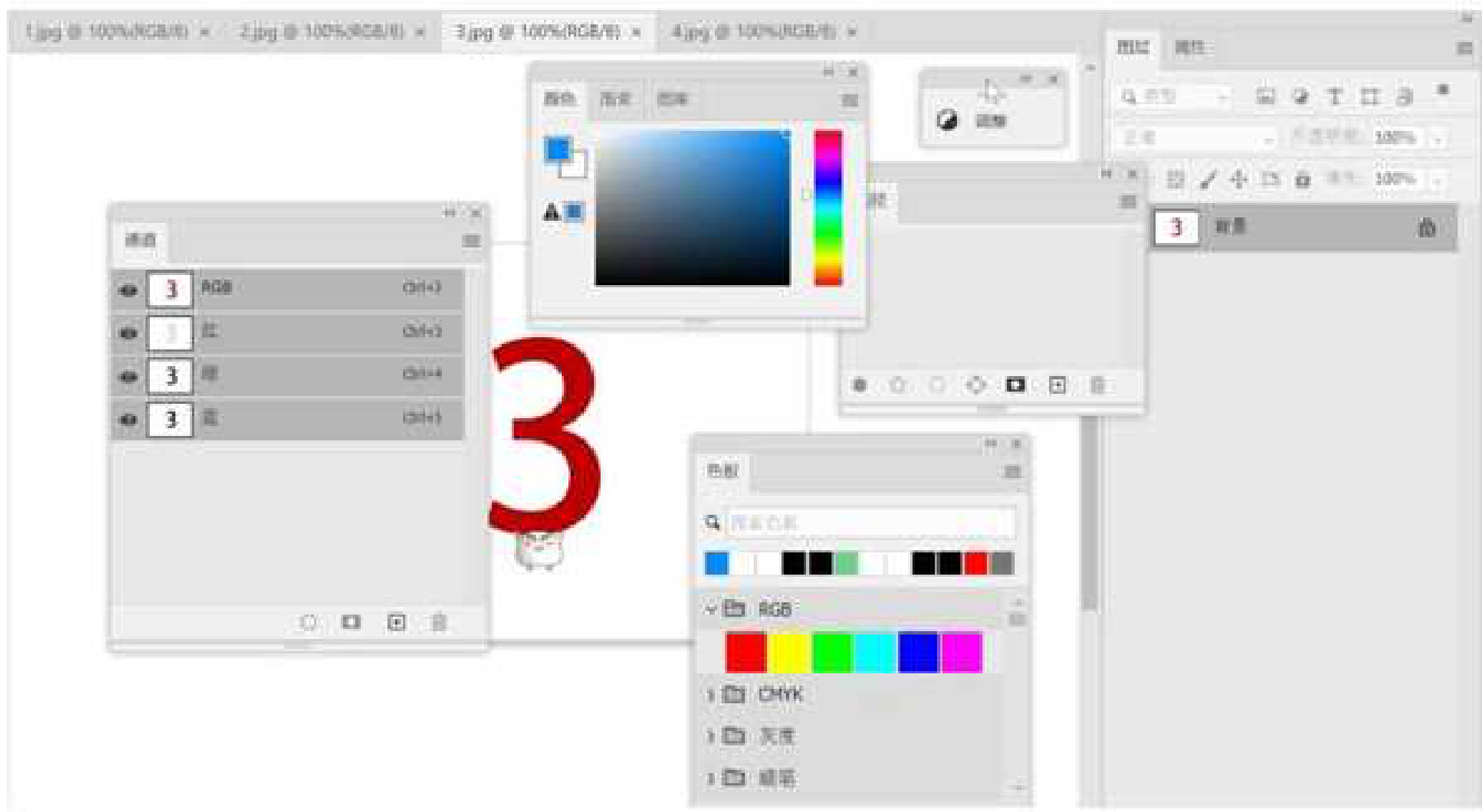 这里单击【打开】按钮,打开本课的素材——4张带有数字的图片。你可以选择全部并打开它们,这样你就进入了Photoshop的工作主界面。