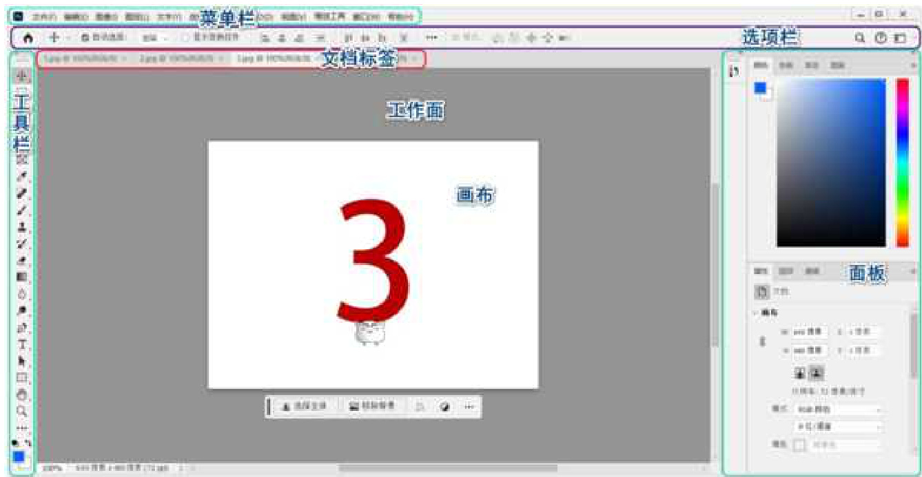 本课主要讲解菜单栏、工具栏、选项栏、工作面和面板。